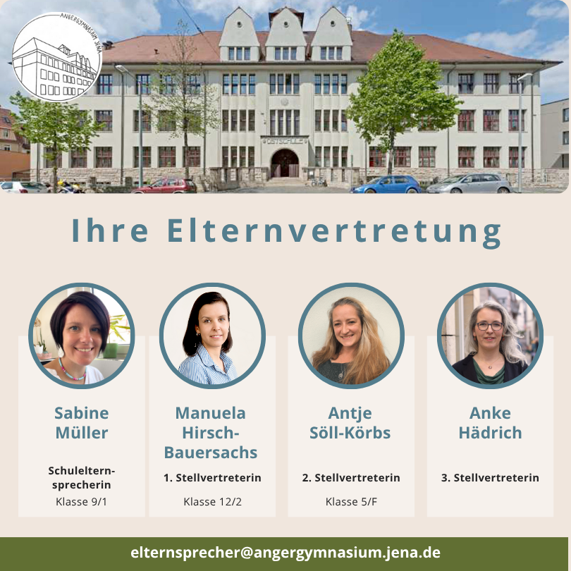 Verhalten bei Fragen oder Anliegen: Bitte beachten Sie, dass bei Fragen oder Anliegen, die speziell Ihre Klasse betreffen, zunächst die jeweiligen Klassenlehrerinnen und Klassenlehrer, Ihre Klassenelternvertretung, sowie die konkreten Fachlehrkräfte Ihre ersten Ansprechpartner sind. Diese können Sie direkt über die auf der Homepage hinterlegten Kontakte erreichen (Kollegium – Angergymnasium Jena).