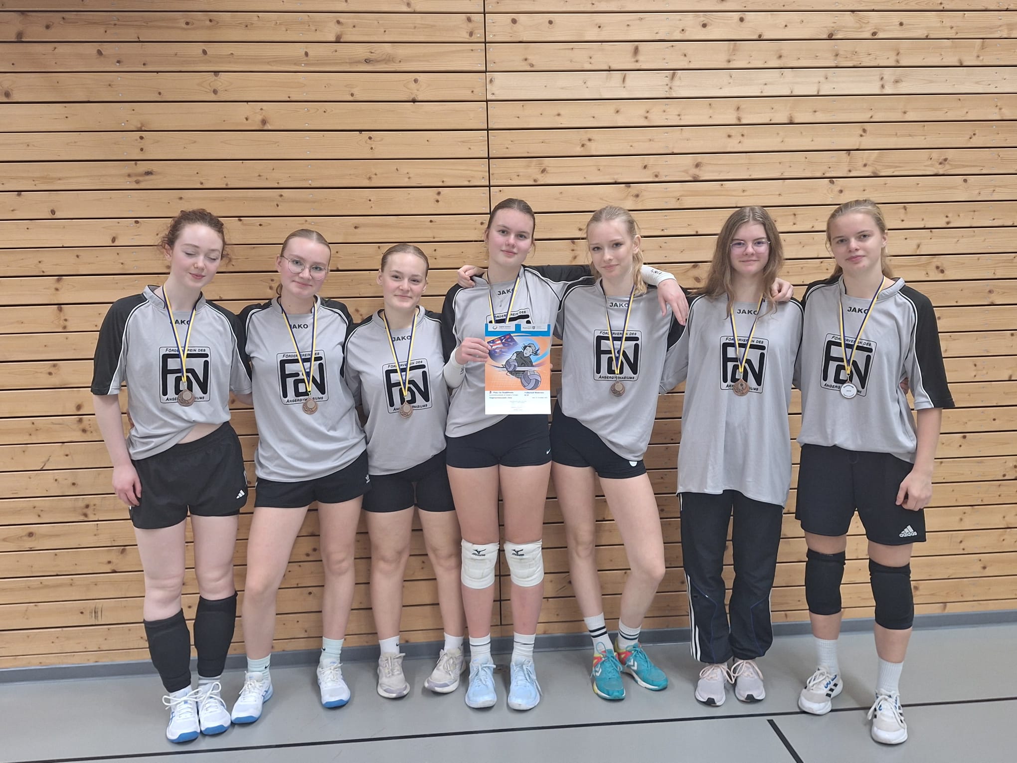 Beim Stadtfinale Volleyball U18 weiblich erreichte unsere Mannschaft einen guten 3.Platz. Alle Spiele waren umkämpft und spannend mit knappen Spielergebnissen. Die Vorrunde wurde souverän gemeistert. Leider ging das Halbfinale gegen die ARO knapp mit 2:1 Sätzen verloren. Im Spiel um Platz 3 wurde im Anschluss gegen die Montessori Schule mit 2:0 gewonnen.