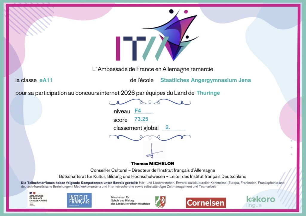 Dem eA 11 Französisch und dem eA 12 Französisch gelang es, jeweils einen 2.Platz im Concours Internet in Thüringen zu belegen.Anlässlich des…